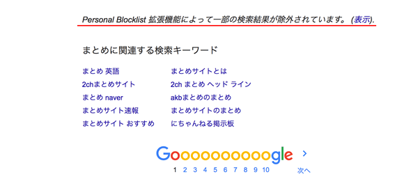 非表示にされているサイトがあるときは、検索結果の最後にPersonal Blocklist 拡張機能によって一部の検索結果が除外されています。 (表示).