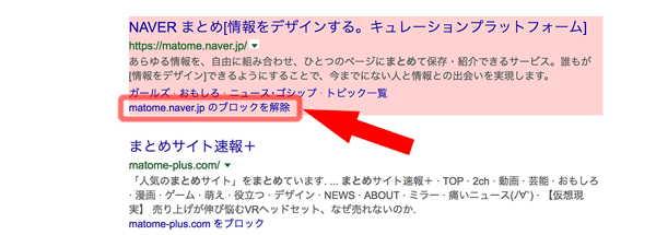 一時的に表示されているサイトは囲み付きで表示され、非表示になっている状態を取り消したいときは、「xxxxx のブロックを解除」をクリックすると再び検索結果に現れるようになります。
