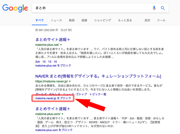 検索結果に表示したくないサイトがあるときは、サイト名で検索して検索結果に出せば簡単に非表示サイトに追加(サイトをブロック)することができます。